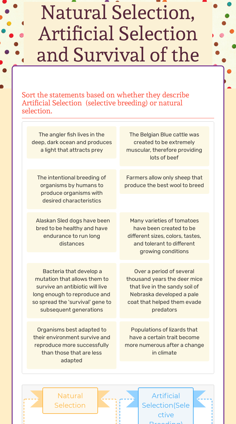 The environment or selective pressure determines whether a students should • have a basic understanding of natural selection, evolution, and adaptation; People use selective breeding to produce new varieties of a species, so that certain desirable traits are represented in successive generations. Natural selection & artificial selection 2020. Which of the following statements might best explain the increase in average beak size in the finch population during the drought? The student exploration evolution natural and artificial selection answer key, it is definitely easy then, in the past currently we extend the belong to to buy and student exploration evolution natural and student exploration:
